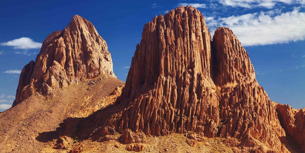 Le Tassili Hoggar, dont la ville principale est Tamanrasset : Hoggar (Ahaggar en Tamahaq, la langue berbère des Touaregs) "Le Hoggar est la partie la plus méridionale du Sahara algérien. Il couvre une superficie de 480 000 km². Tamanrasset, sa capitale administrative, se trouve à 2 000 km au sud d'Alger (par la route). Le Hoggar est limité au nord par le Tidikelt et le Touat (In Salah est à 700 km de Tamanrasset), à l'est par le Tassili n'Ajjer (Djanet est à 700 km), au sud par le Niger (Agadès est à 900 km), et au sud-ouest par le Mali (Kidal est à 840 km). À l'ouest, le Hoggar est bordé par le Tanezrouft, tandis que le Ténéré marque sa limite sud-est. La frontière algéro-nigérienne se situe à 430 km au sud de Tamanrasset, à In Guezzam. Le Hoggar est un massif ancien de plateaux étagés de granit et de gneiss, dominés par des crêtes ou des pitons. La partie la plus élevée, le Koudiat, au-dessus de Tamanrasset, est un massif volcanique démantelé de coulées basaltiques et de pics étranges (le Tahat culmine à 2 918 m). Le massif est bordé par les escarpements et les plateaux du Tassili. Moins aride que le reste du désert en raison de son altitude, il est habité par les Kel Ahaggar, les plus célèbres des Touaregs. Des recherches minières ont révélé la présence d'uranium et de métaux précieux.