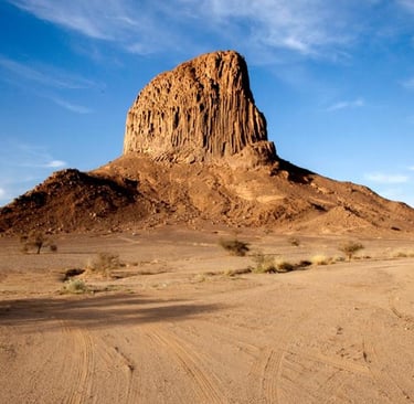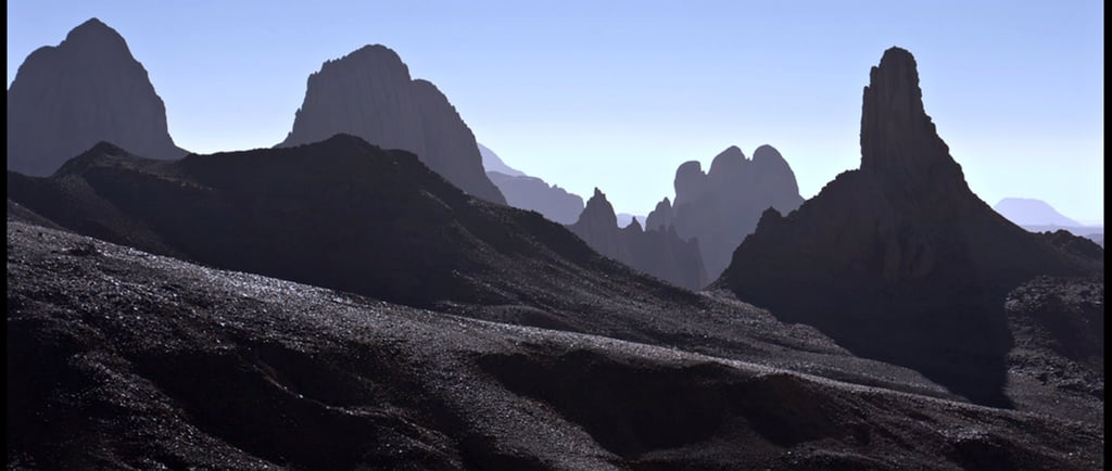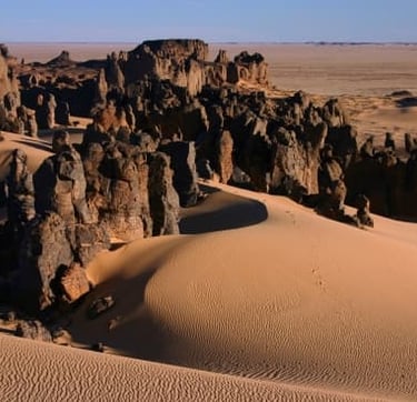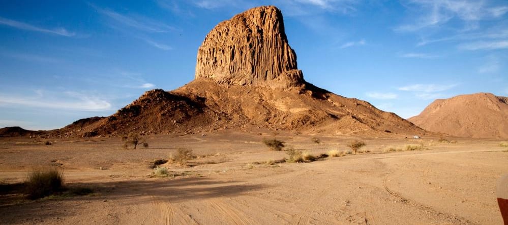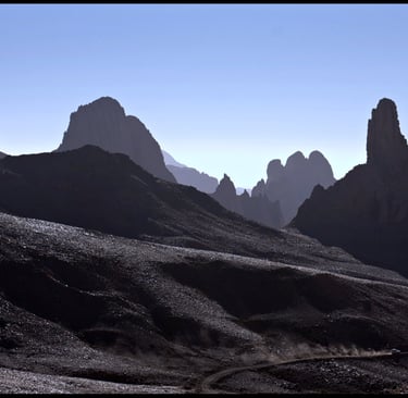 Tassili Hoggar, whose main town is Tamanrasset: Hoggar (Ahaggar in Tamahaq, the Berber language of the Tuaregs) "The Hoggar is the southernmost part of the Algerian Sahara. It covers an area of 480,000 km². Tamanrasset, its administrative capital, lies 2,000 km south of Algiers (by road). The Hoggar is bounded to the north by the Tidikelt and Touat (In Salah is 700 km from Tamanrasset), to the east by the Tassili n'Ajjer (Djanet is 700 km away), to the south by Niger (Agadès is 900 km away), and to the south-west by Mali (Kidal is 840 km away). To the west, the Hoggar is bordered by the Tanezrouft, while the Ténéré marks its southeastern limit. The Algerian-Nigerian border lies 430 km south of Tamanrasset, at In Guezzam. The Hoggar is an ancient massif of stepped plateaus of granite and gneiss, dominated by ridges or pitons. The highest part, Koudiat, above Tamanrasset, is a dismantled volcanic massif of basaltic flows and strange peaks (Tahat reaches 2,918 m). The massif is bordered by the escarpments and plateaus of the Tassili. Less arid than the rest of the desert due to its altitude, it is inhabited by the Kel Ahaggar, the most famous of the Tuareg. Mining research has revealed the presence of uranium and precious metals.