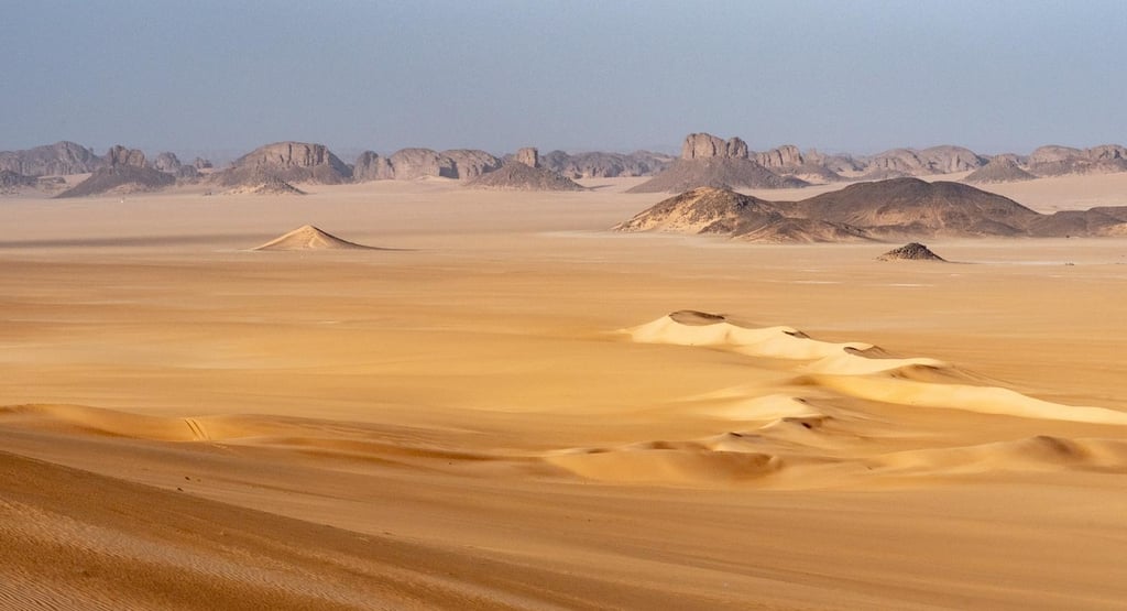 阿德梅尔沙漠是阿尔及利亚东南部伊利济省的一片广阔沙地,长约 100 公里,宽约 20 公里。它位于 Djanet 以西,起始于 Tassili n'Ajjer 中心,靠近 Essendilène,向南延伸至与尼日尔交界的 Ténéré 河。Erg Admer 以东是 Wadi Teghaghart,这里有壮观的 "哭泣的奶牛 "岩刻。